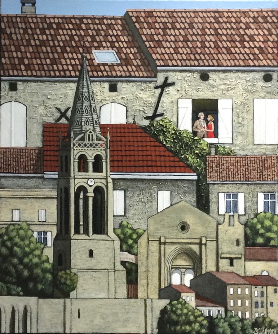 Mon premier tableau de cette année 2026 est une nouvelle inversion de perspective sur le village de Saint-Emilion. C'est l'endroit où je réside, mais également l'endroit où je travaille dans ma propre galerie d'Art, la galerie "Dousdebes & Co". Il y a pire comme endroit... J'ai bien de la chance..